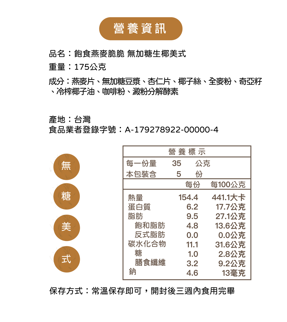 成分:燕麥片、無加糖豆漿、杏仁片、椰子絲、全麥粉、奇亞籽、冷榨椰子油、咖啡粉、澱粉分解酵素