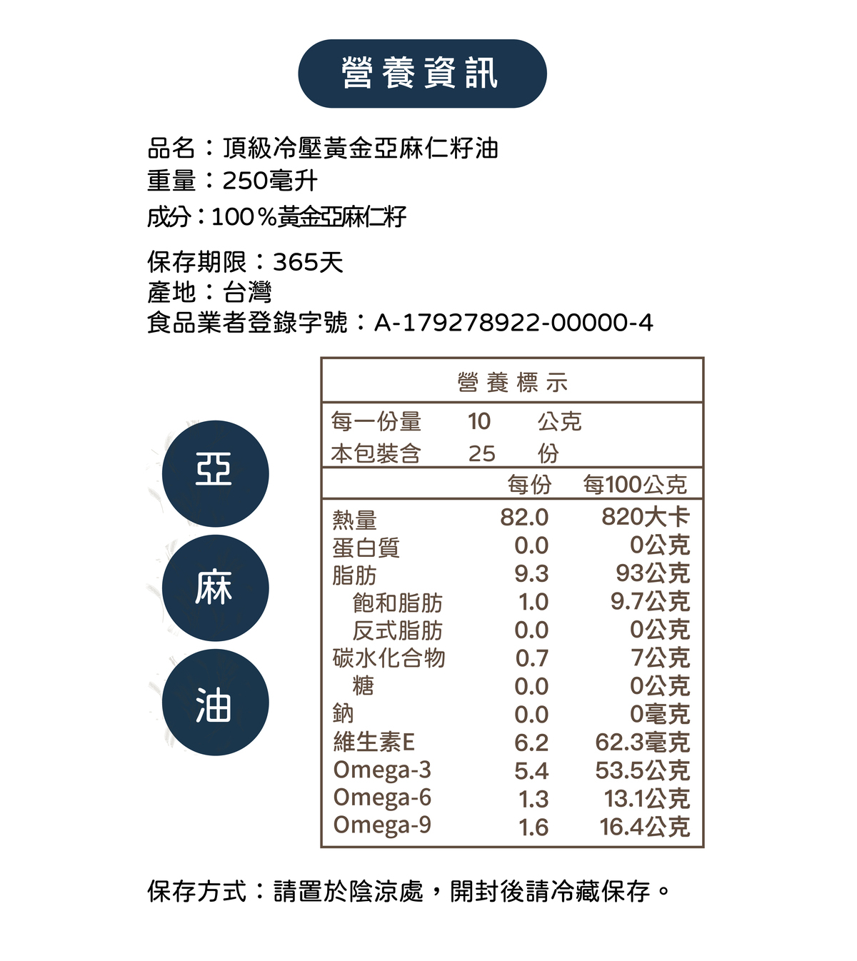 風味:天然黃金亞麻用冷壓方式製作,會帶有微苦、微腥味。
