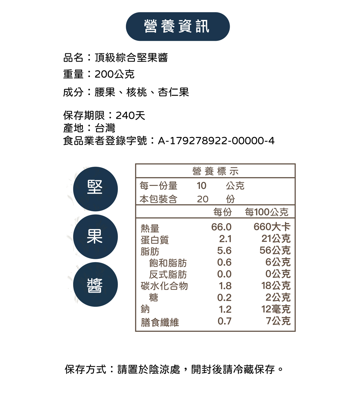 保存期限:12個月 (置於陰涼處,開封後請冷藏)