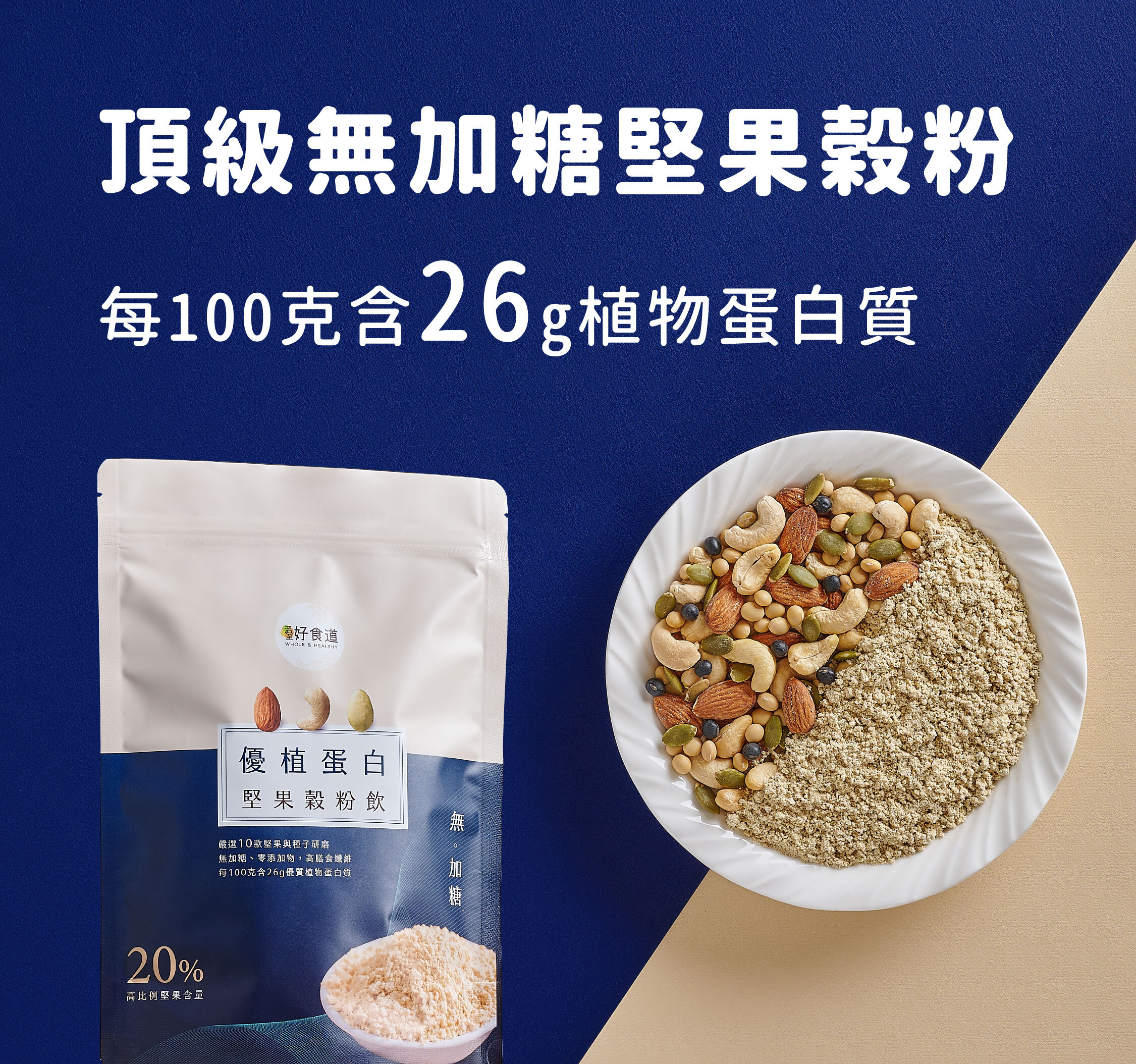 嚴選 10 種豆類、堅果與低澱粉種子研磨,堅果比例高達 20%,無加糖零添加物,每 100g 含 26g 植物蛋白質與豐富膳食纖維。