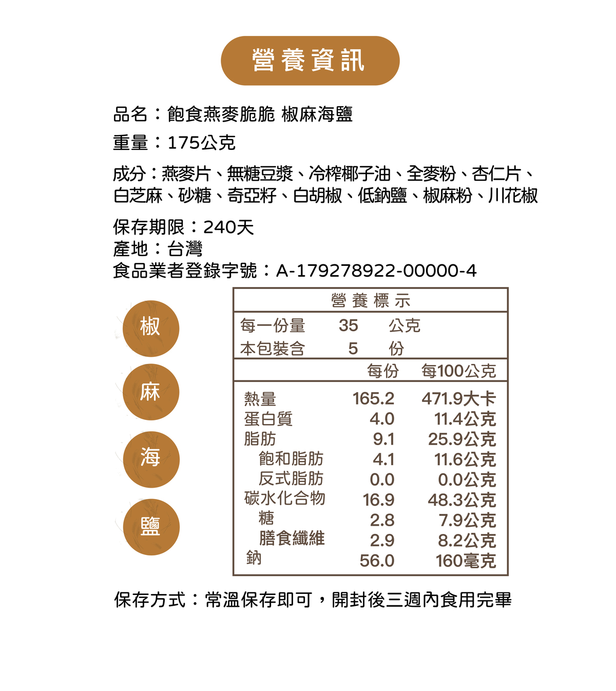 成分:燕麥片、無糖豆漿(無基改)、冷榨椰子油、全麥粉、杏仁片、白芝麻、砂糖、奇亞籽、白胡椒、低鈉鹽、椒麻粉、川花椒